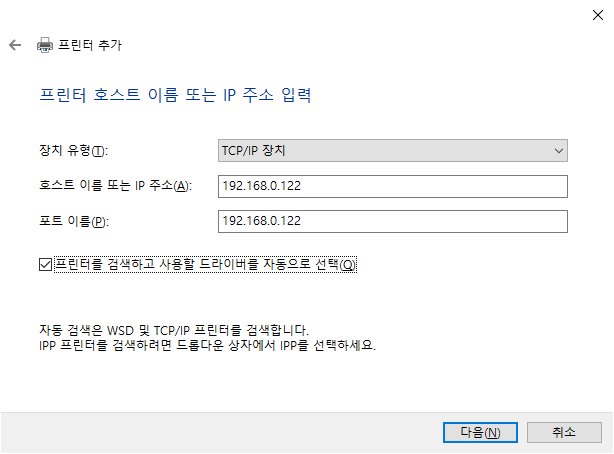 네트워크 프린터는 IP 주소를 이용하여 연결합니다.