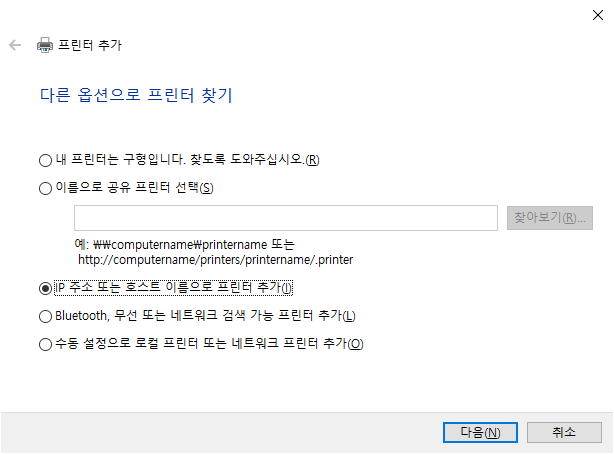 5. "TCP/IP 주소 또는 호스트 이름으로 프린터 추가" 선택 후 프린터의 IP 주소 입력