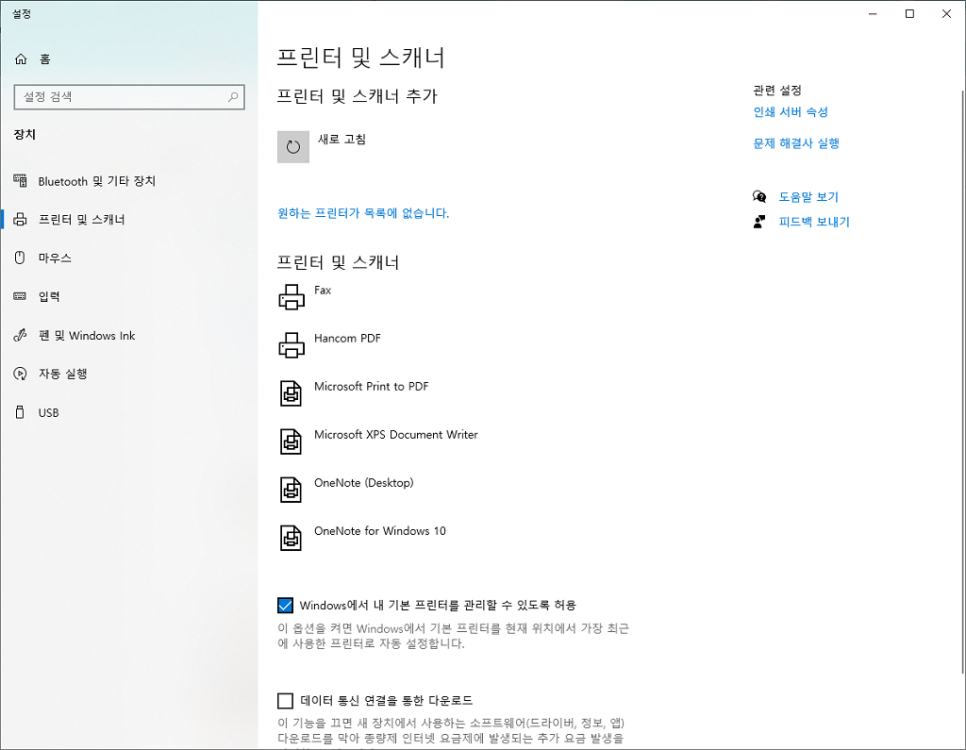 4. 설정 > 장치 > 프린터 및 스캐너에서 프린터가 정상적으로 등록되었는지 확인합니다.